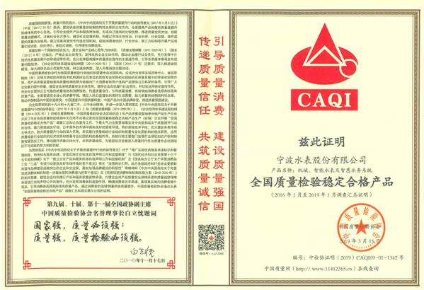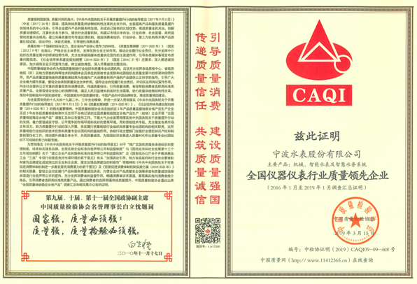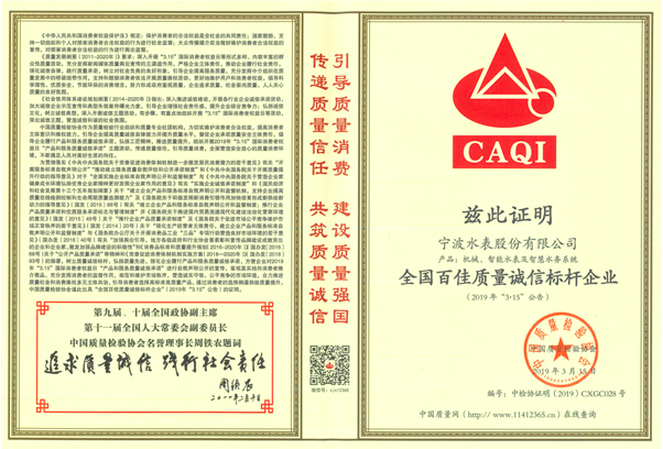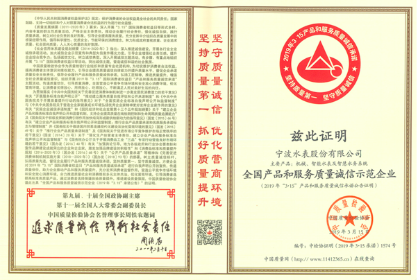为响应国家推进质量强国建设,严格企业主体责任,推动企业履行社会责任,践行质量承诺的号召,中国质量检验协会组织开展了“3.15”国际消费者权益日系列主题活动,宁波水表股份有限公司在活动评选中获得4项荣誉:全国产品和服务质量诚信示范企业、全国百佳质量诚信标杆企业、全国质量检验稳定合格产品及全国仪器仪表行业质量领先企业。此项评选结果是通过对企业自2016年1月至2019年1月期间调查汇总所得,充分肯定了宁波水表近几年来在质量诚信、服务领先方面的良好表现。